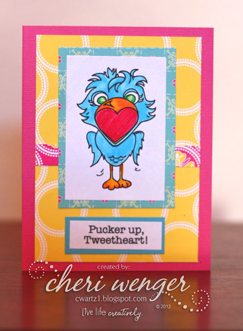 This card of softly layered colors with a brightly colored digi stamp makes an adorable Valentine or Anniversary card. I created it with the bird digi stamp image from my Big Mouth Valentines digi stamps set: